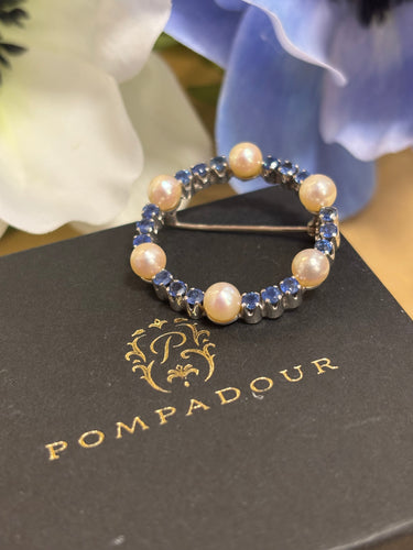 Brosch 18k vitguld, safirer och pärlor