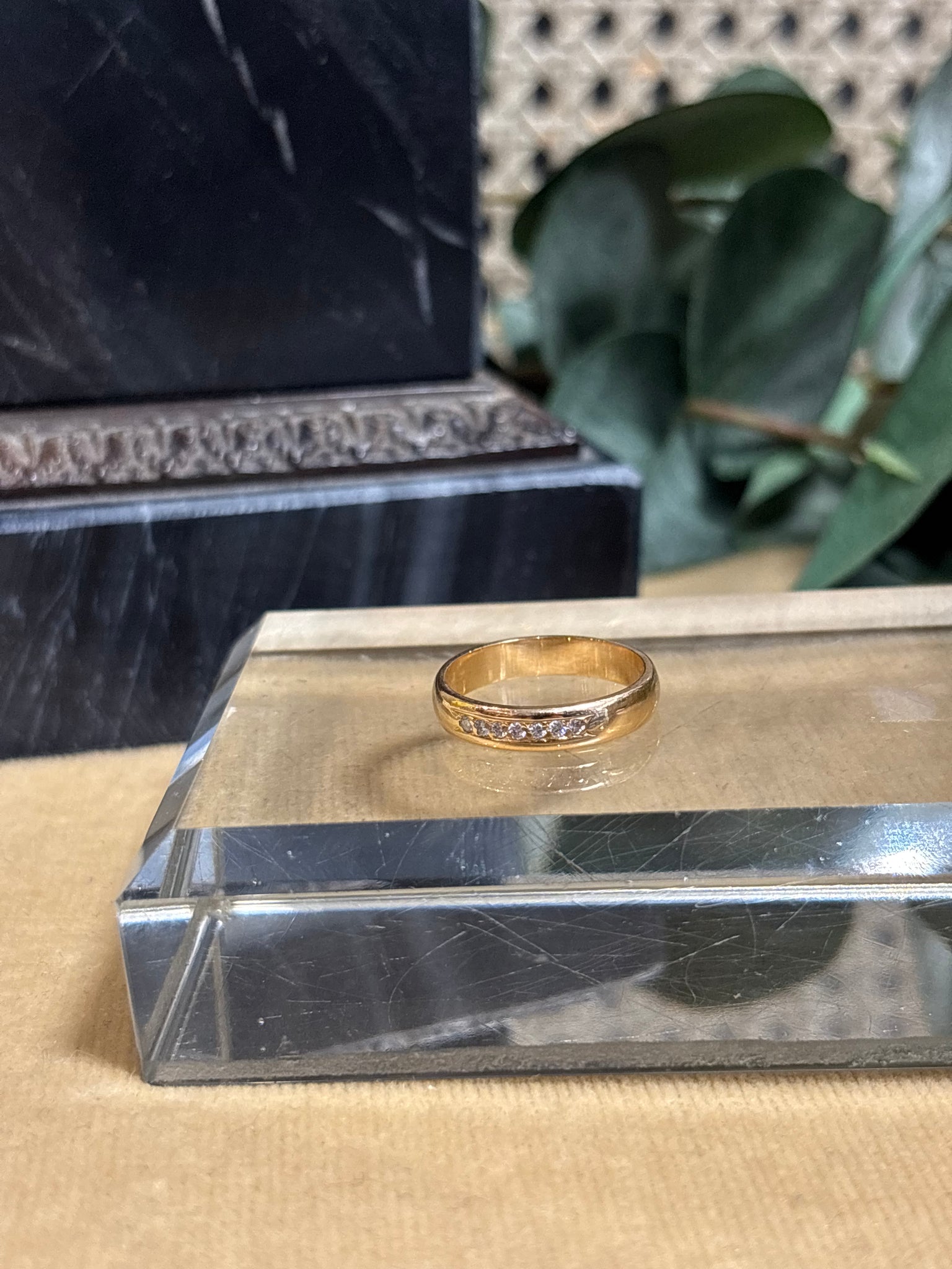 Alliansring med 7 stycken briljantslipade diamanter på totalt 0,14ct. Tillverkad 1988. Bredd: 4mm