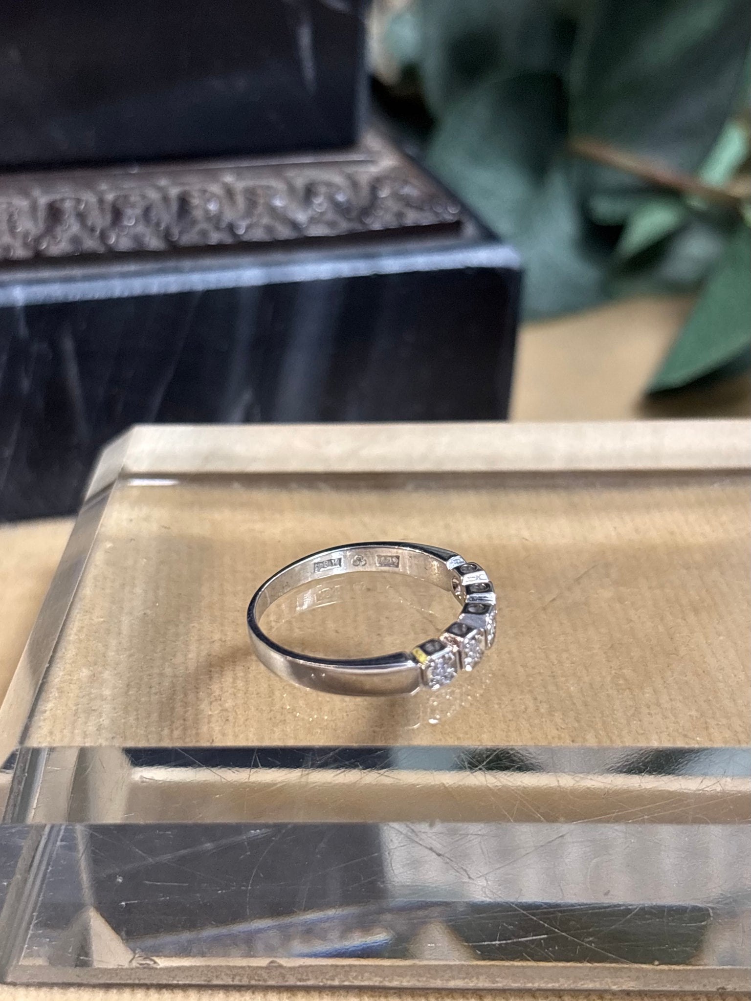 Alliansring i 18k vitguld, 5 diamanter på totalt 0,08ct. Tillverkad 1975 av Ceson, Göteborg.
