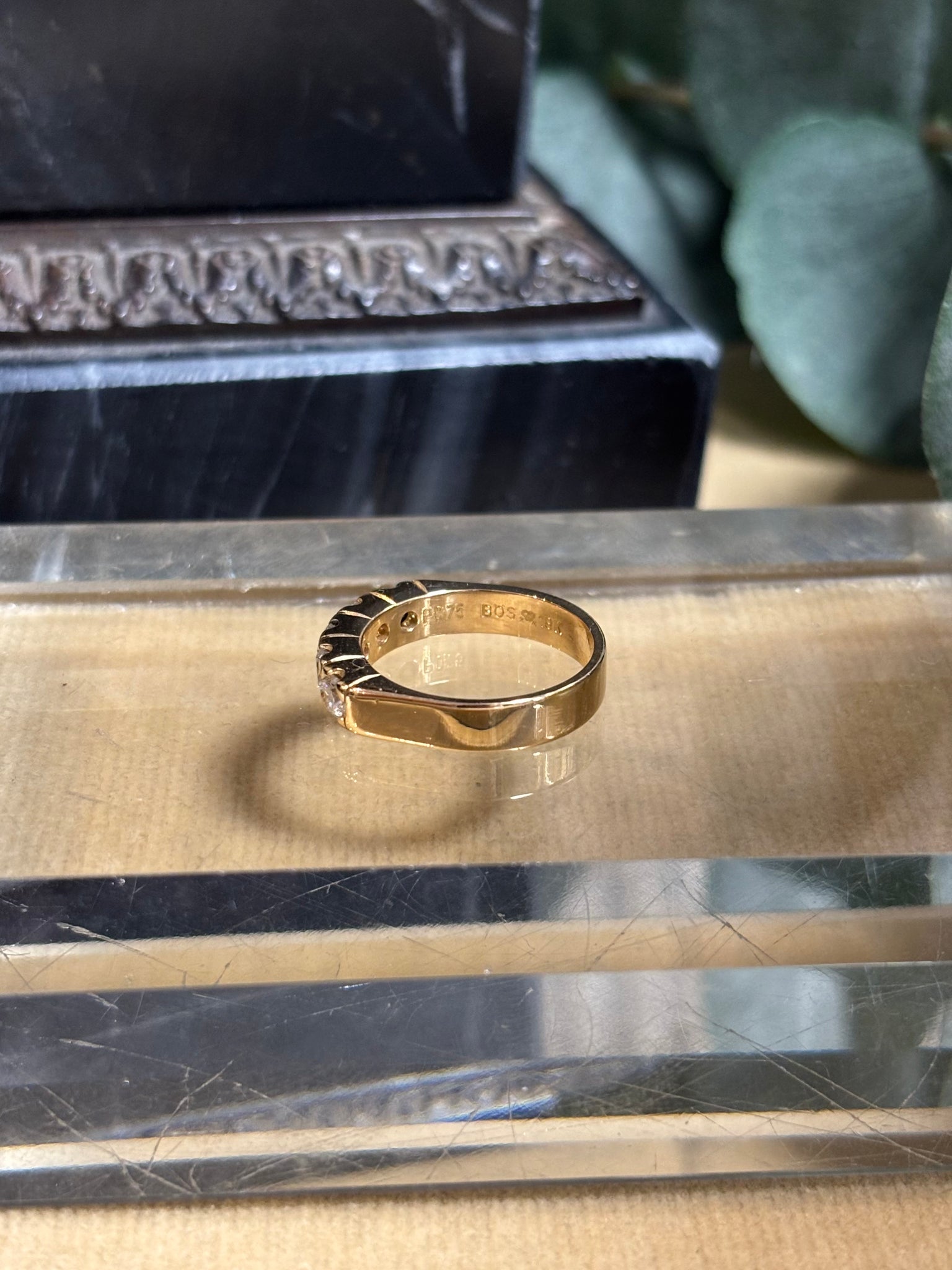 Alliansring i 18k guld med 5 stycken diamanter på totalt 0,75ct. Tillverkad av Schalins. Bredd ca 4mm