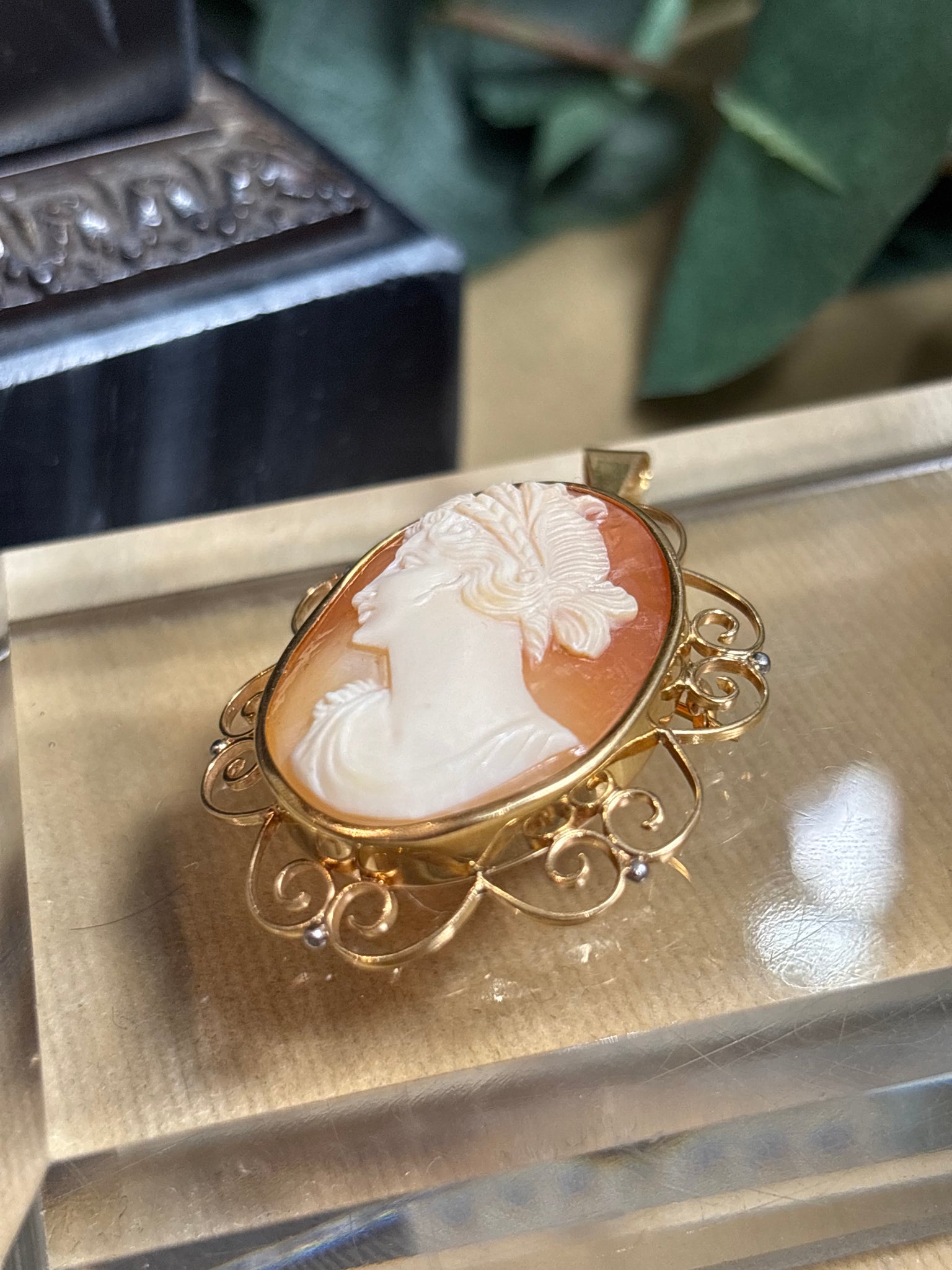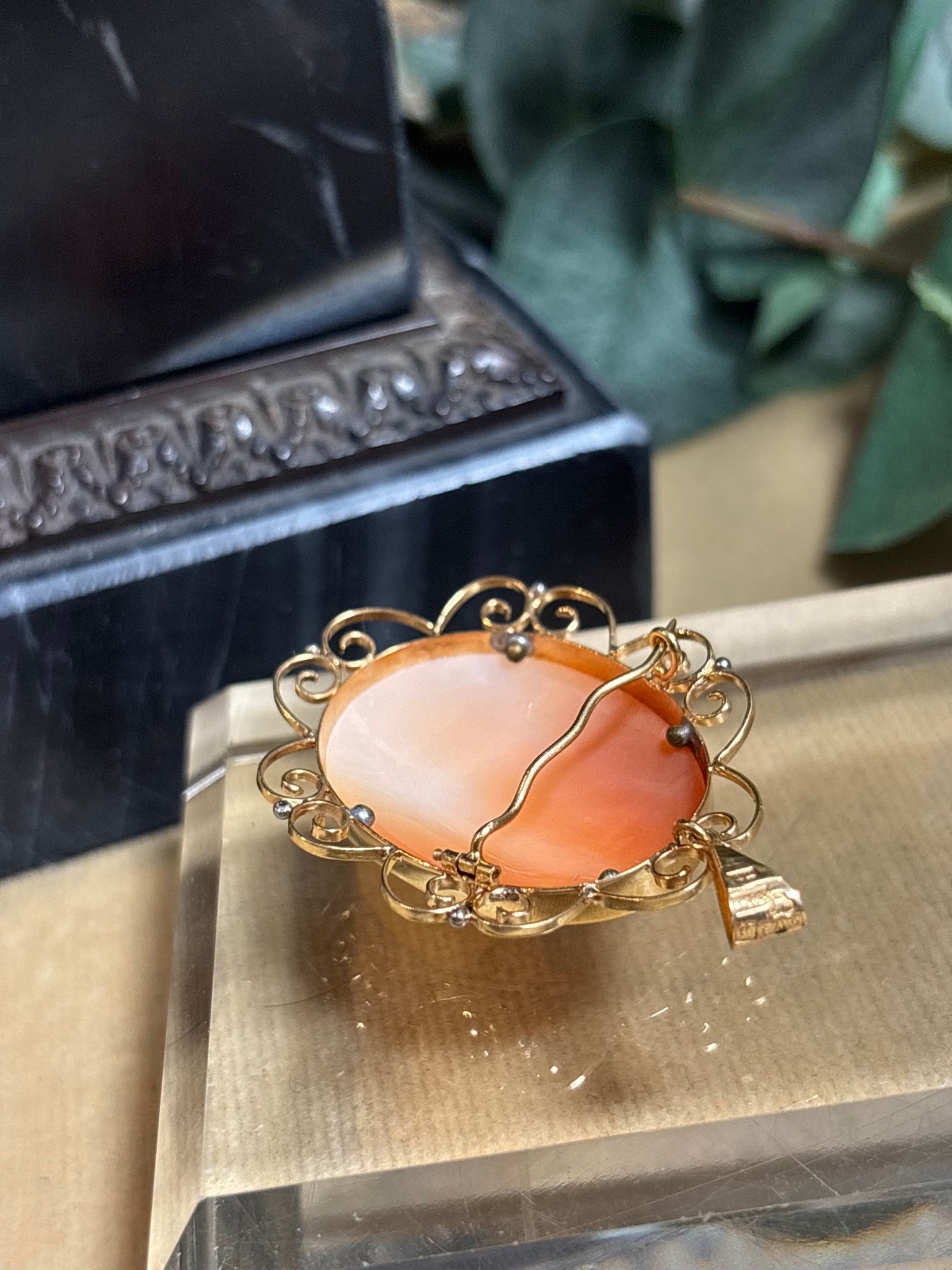 Elegant utskuren snäckskalscamé med en välarbetad ram i 18k guld. Går att använda som både brosch och hängsmycke. Tillverkad 1949 av Parmegiani & Co i Köping, verksamma 1949-1951