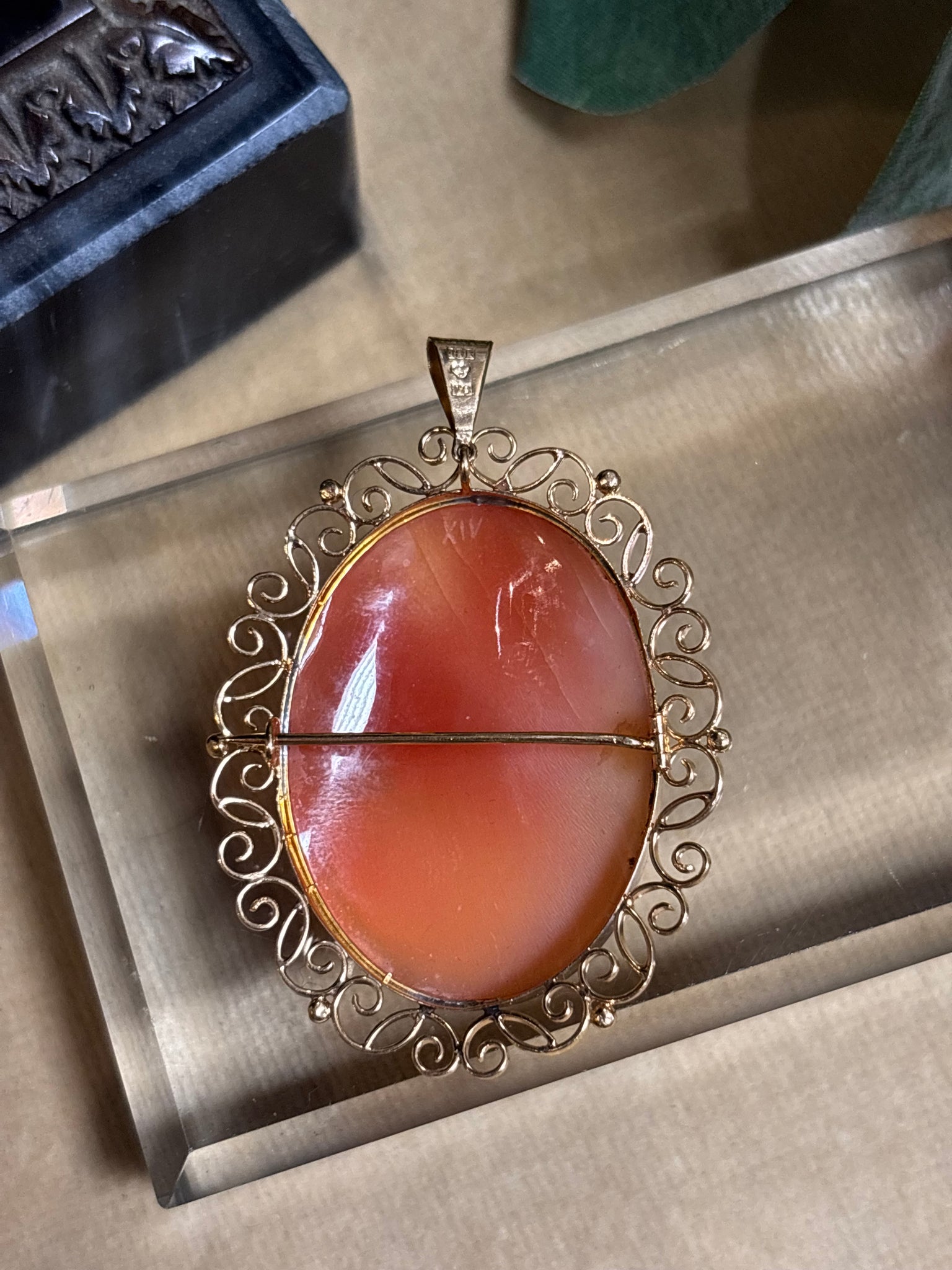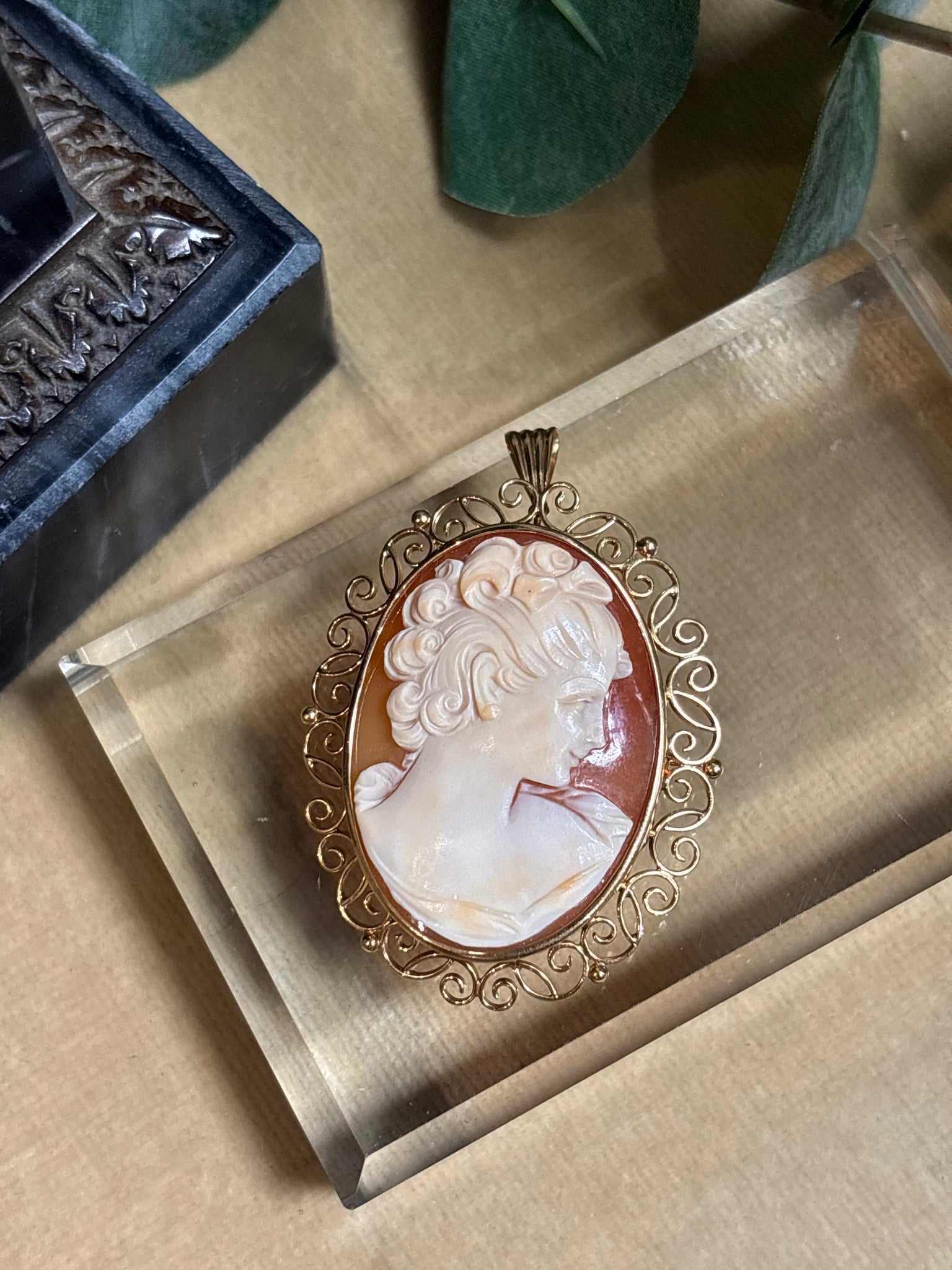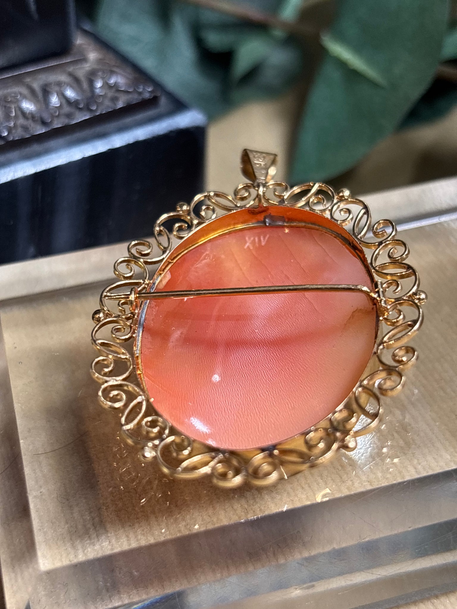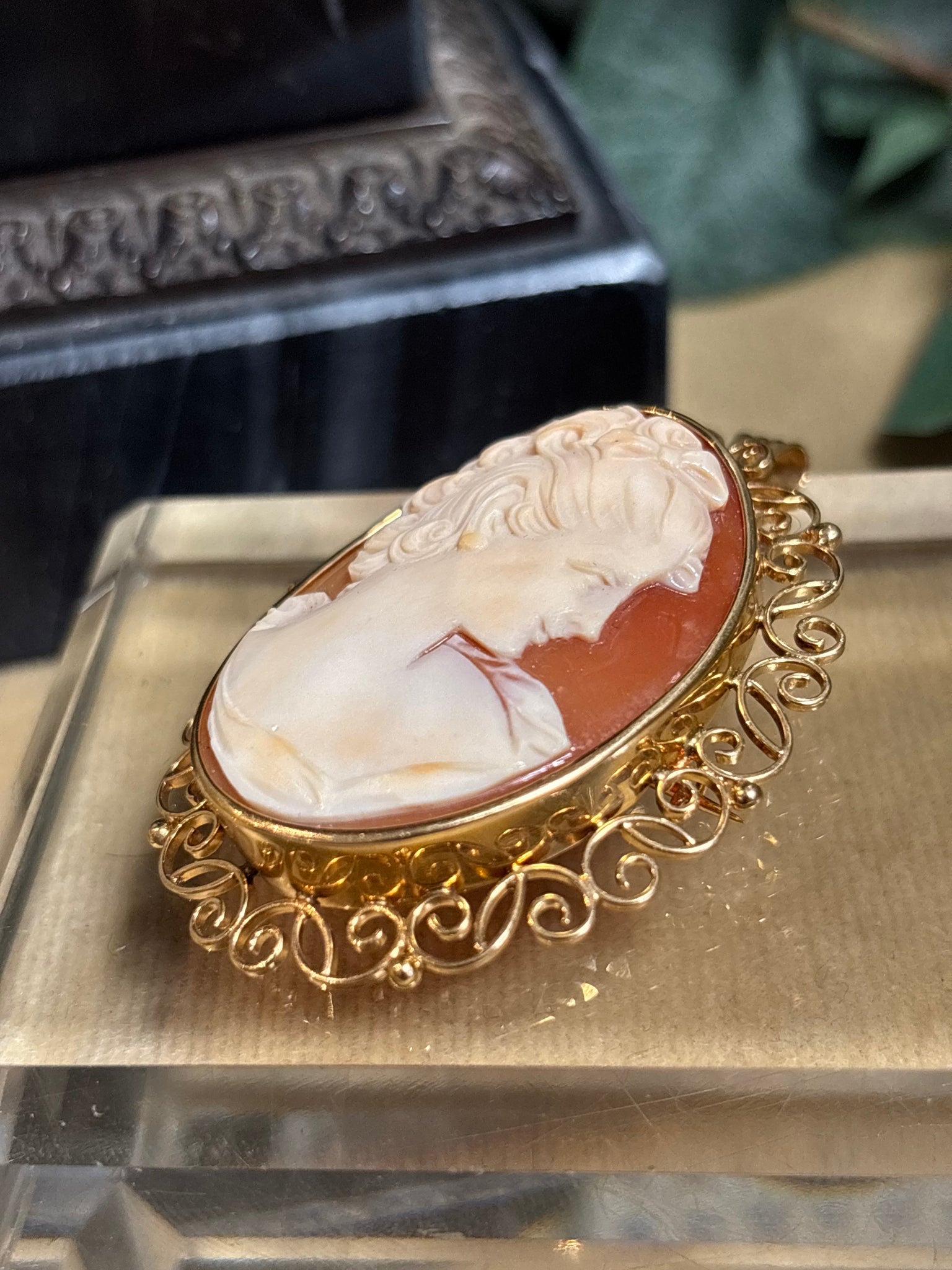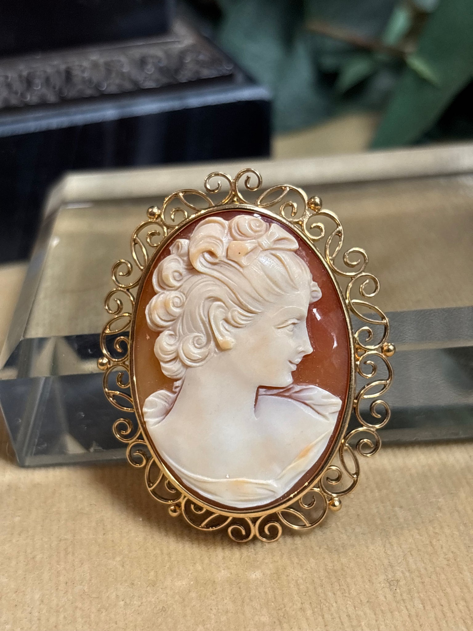 Elegant utskuren snäckskalscamé med en utsökt välarbetad ram i 18k guld. Går att använda som både brosch och hängsmycke. Tillverkad 1947, oläsliga namn och ortstämplar.