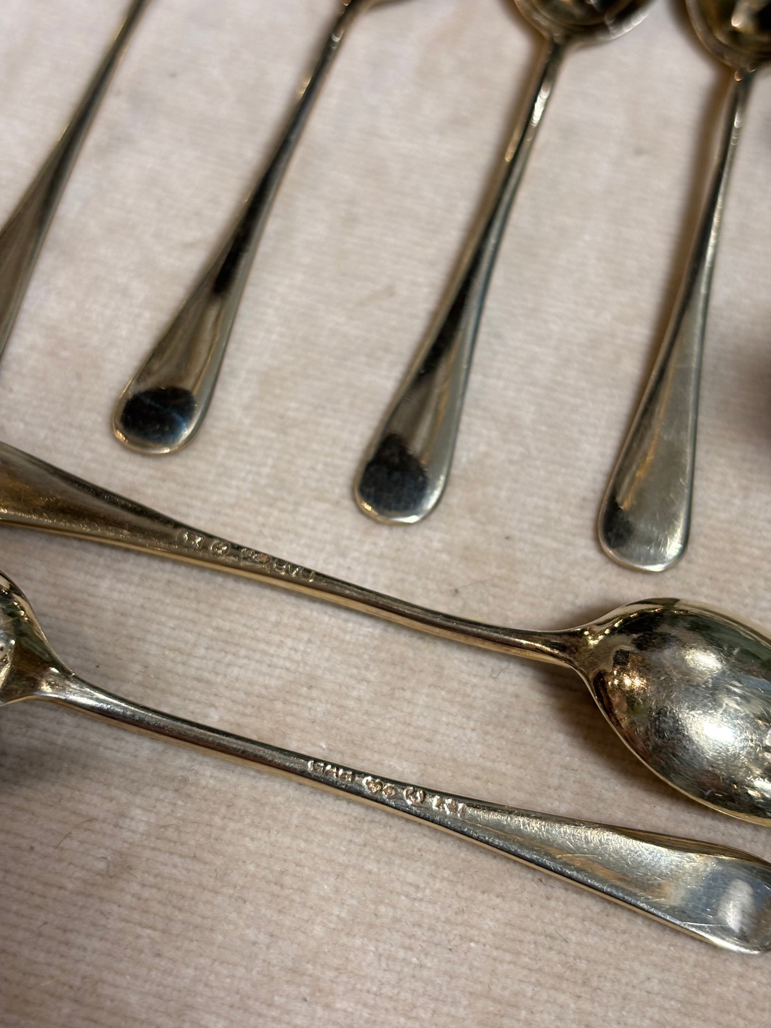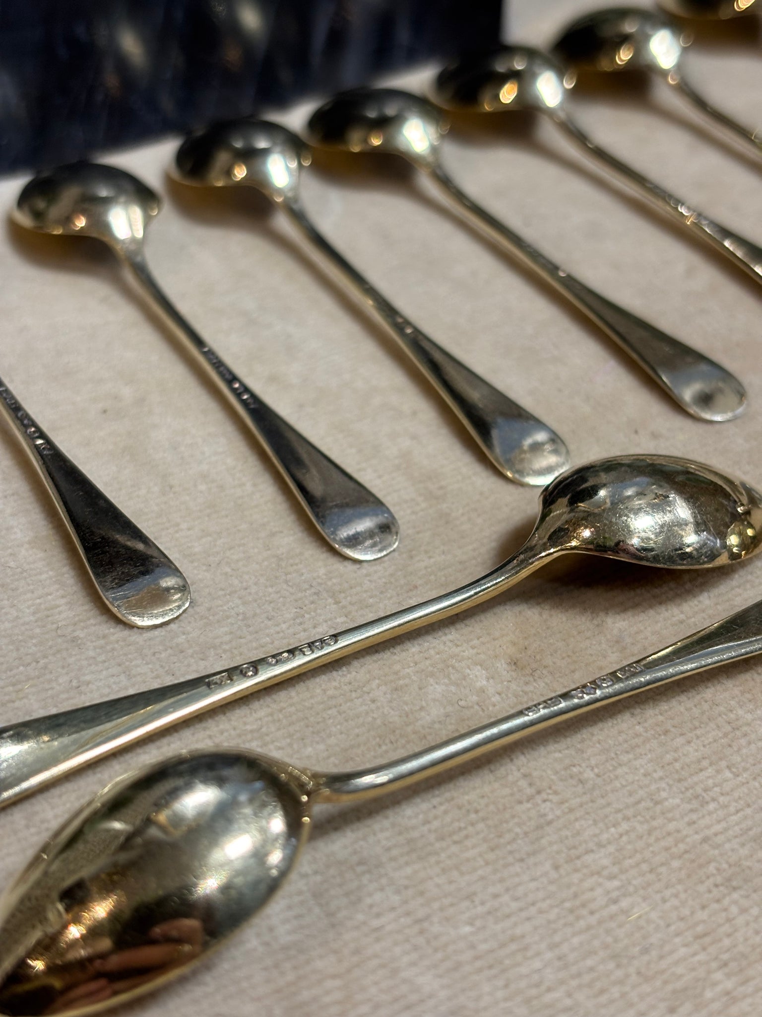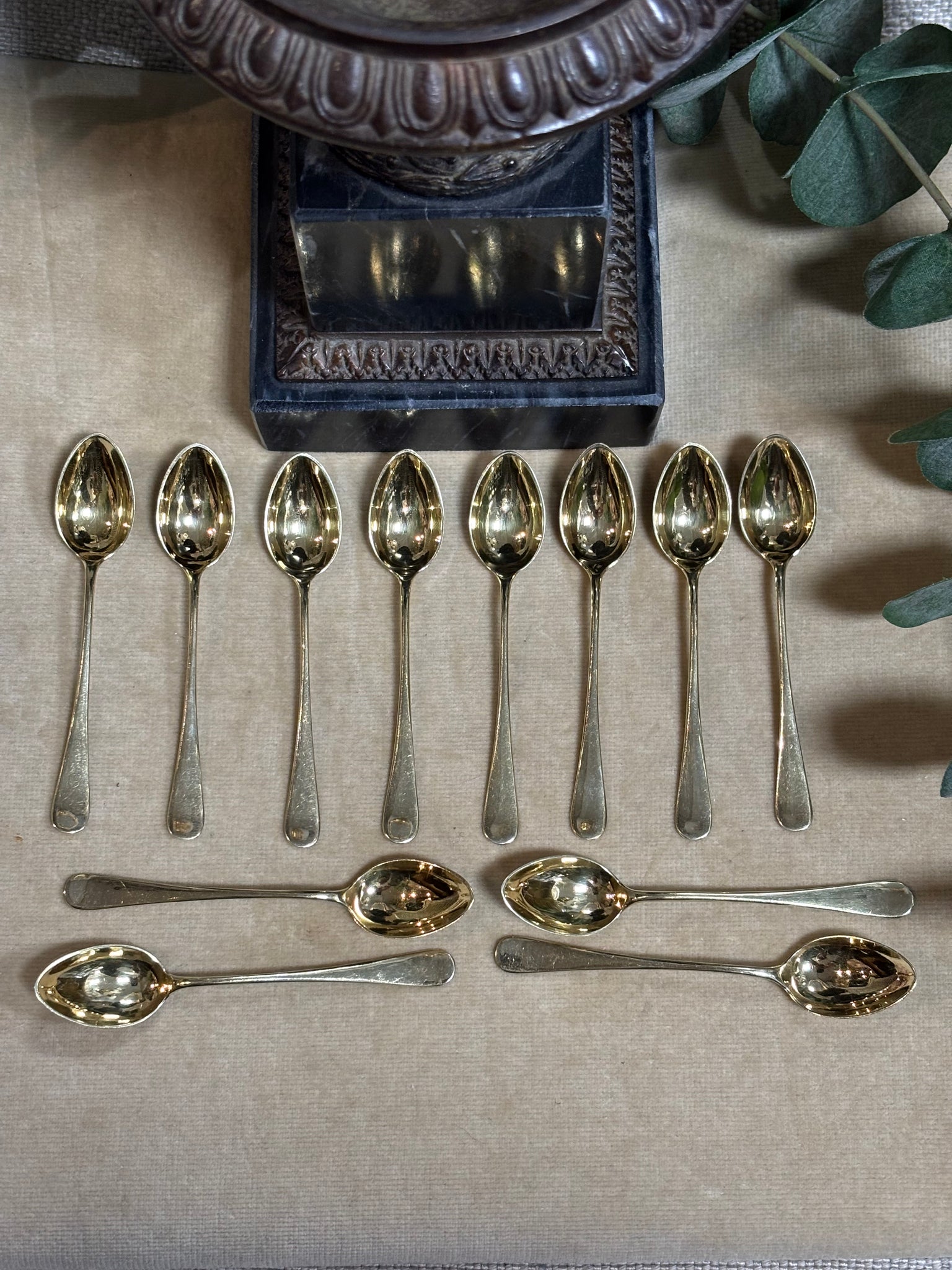 Ett dussin antika moccaskedar i förgyllt silver från GAB, 1924