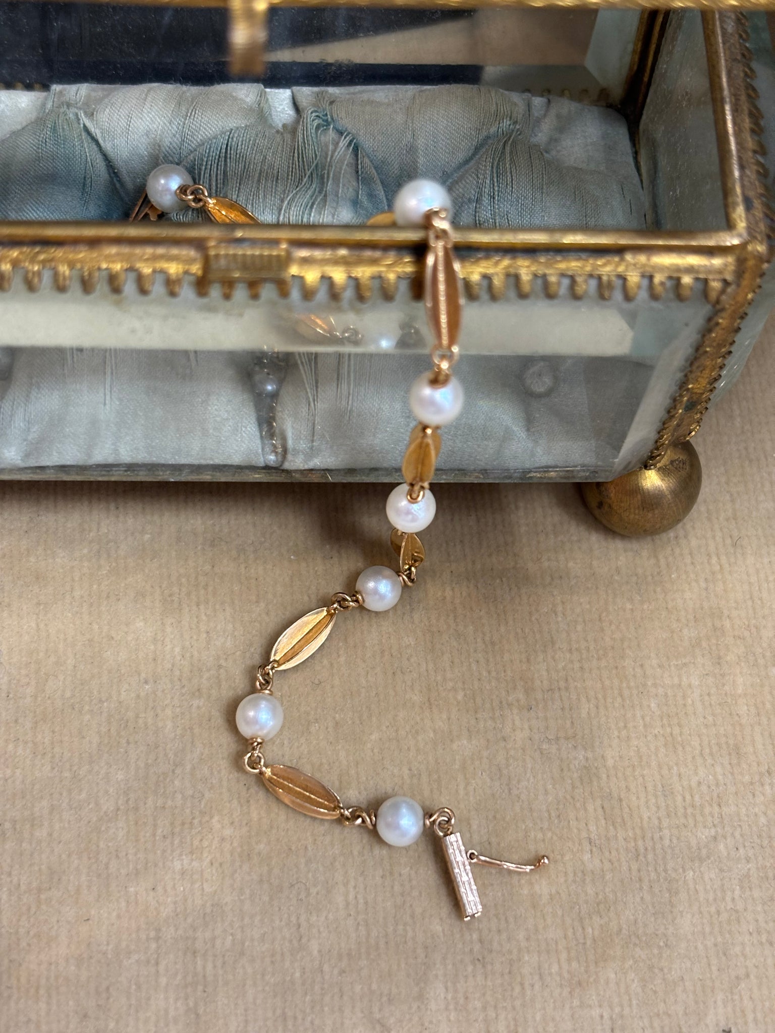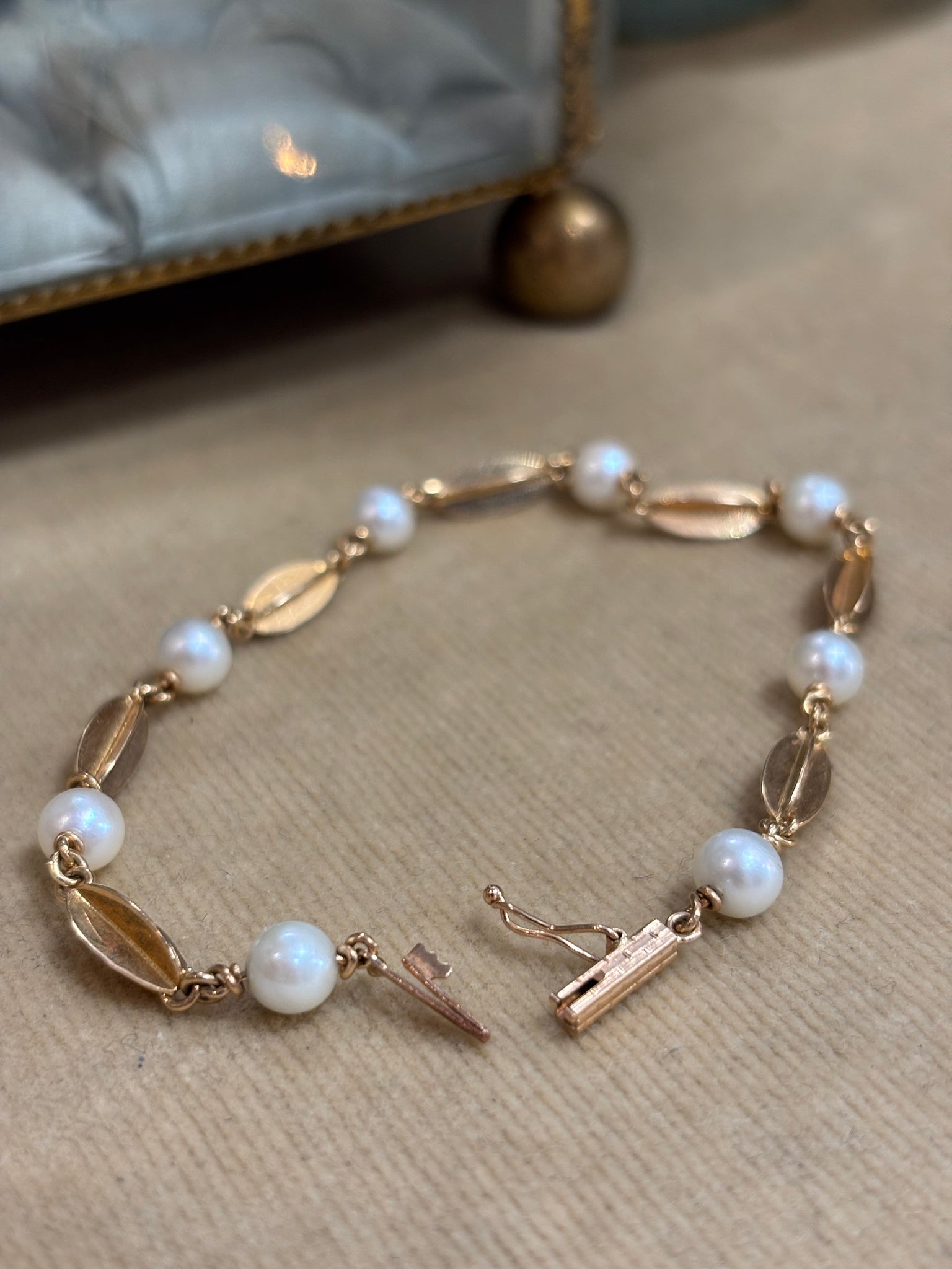 Armband i 18k guld med kistlås, åtta stycken odlade saltvattenpärlor, 6mm. Tillverkad 1964, Trege, Göteborg.
