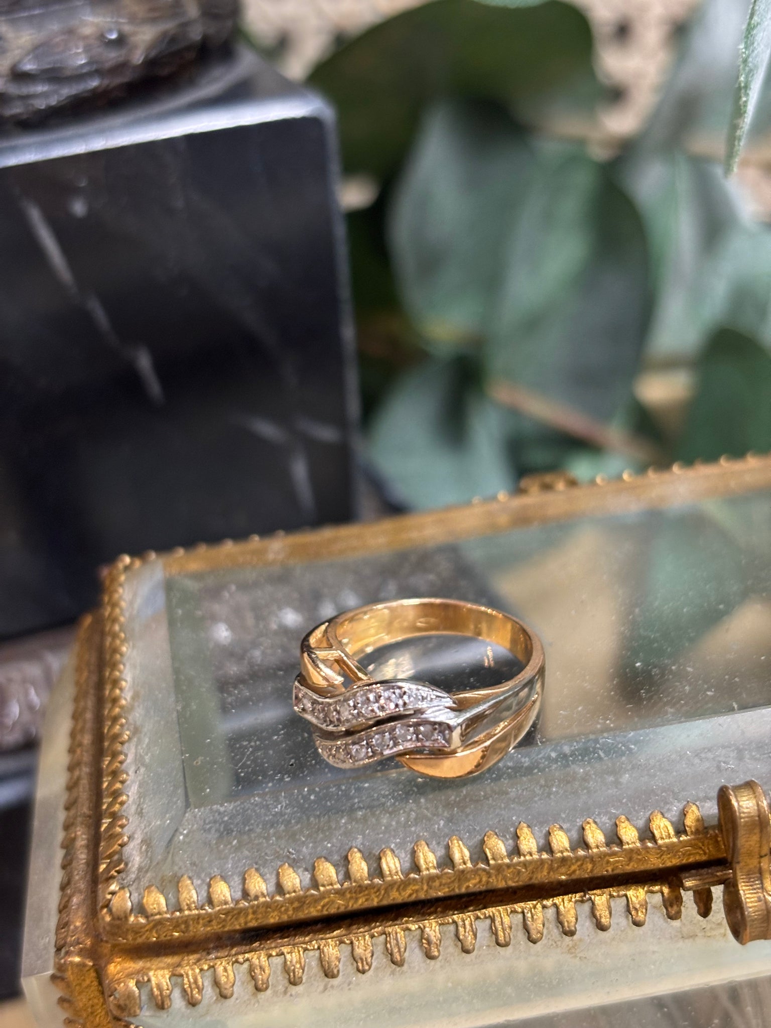 Ring i blandat 18k rött och vitt guld med 14stycken åttkantslipade diamanter på totalt ca 0,28ct. Otydliga stämplar.